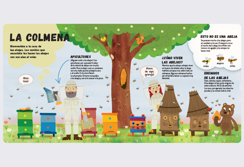 En primavera volarías de flor en flor recogiendo polen con el que tus amigas abejas harían miel después en la colmena. Durante tus viajes a por polen beberías néctar dulce que sabe a refresco de frambuesa. Cuando tuvieras que ir al baño, volarías a un prado, porque las abejas no tienen aseos en la colmena. Y, si tienes suerte, podrías aprender a hacer miel. Venga, ponte cómodo y ven con nosotros a ver cómo es una colmena por dentro.